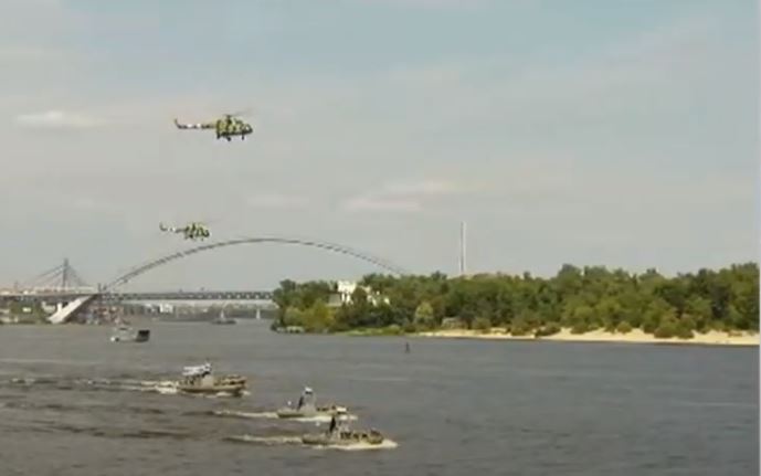 О 14:00 розпочався річковий парад на Дніпрі, який проходить в районі Річкового вокзалу і Труханового острова. Очікується урочисте проходження катерів і проліт авіації, а завершиться парад артилерійським салютом з Труханового острова.