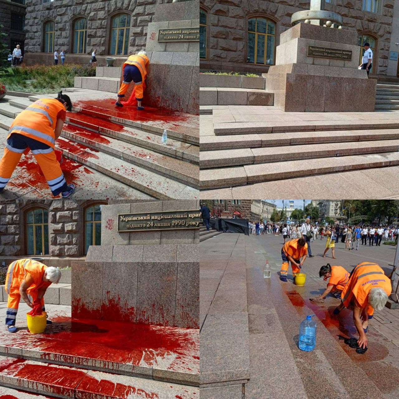 16:20 Після святкових заходів хтось облив фарбою сходи і постамент з прапором біля КМДА.
