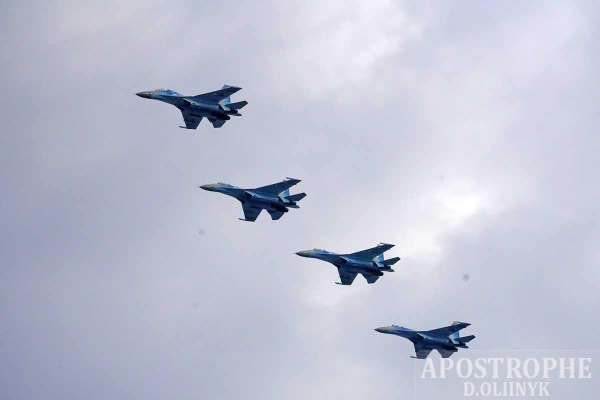 11:55 Над Хрещатиком пройшла повітряна колона з військових вертольотів, літаків-винищувачів, штурмовиків, бомбардувальників і військово-транспортних судів: зокрема, Мі-8, Мі-14, Мі-24, Су-27, МіГ -29, Іл-76 і цілого сімейства "Ан" - Ан-70, Ан-26, Ан-72, Ан-32П. Замикав колону Ан-225