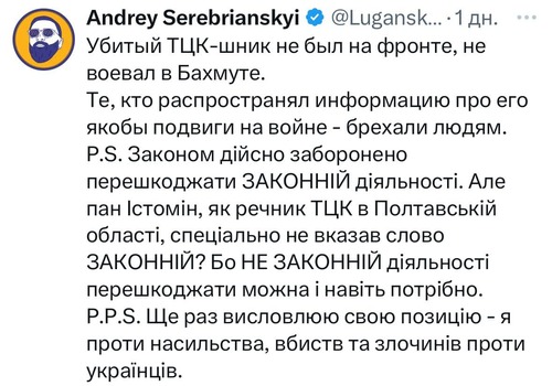 "Цей жахливий злочин не має жодного виправдання. А має бути виключно одностайно засудженим, - запевняє Притула. - Так, далеко не все в роботі ТЦК ідеально і бувають прецеденти, які потребують вивчення і втручання правоохоронних органів. Коли за три роки війни в країні мобілізують мільйон людей, то так, проблем не уникнути. Але кожна проблема має своє прізвище, ім"я та посаду. І в жодному випадку не може бути використана для узагальнення".