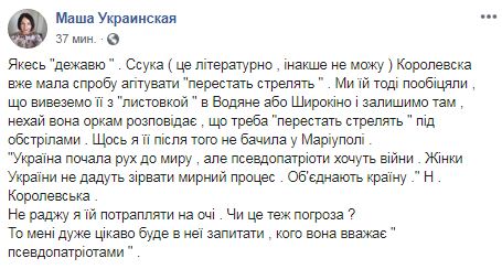"Якесь "дежавю". Королевска вже мала спробу агітувати "перестать стрелять". Ми їй тоді пообіцяли , що вивеземо її з "листовкой " в Водяне або Широкіно і залишимо там, нехай вона оркам розповідає , що треба "перестать стрелять " під обстрілами. Щось я її після того не бачила у Маріуполі. Не раджу я їй потрапляти на очі . Чи це теж погроза? То мені дуже цікаво буде в неї запитати , кого вона вважає " псевдопатріотами", - написала волонтер.