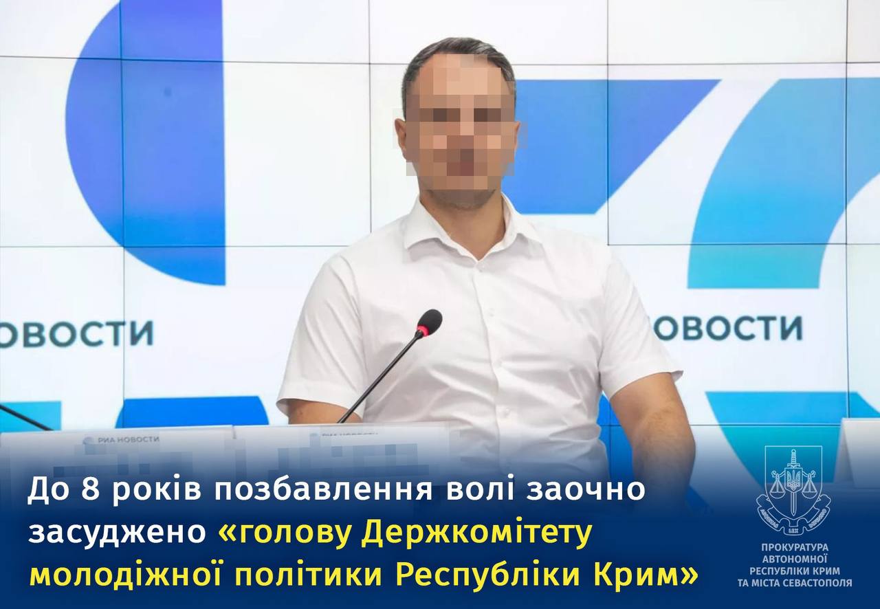 Український суд виніс заочний вирок "голові Держкомітету молодіжної політики Республіки Крим" за співпрацю з РФ, засудивши до восьми років позбавлення волі.