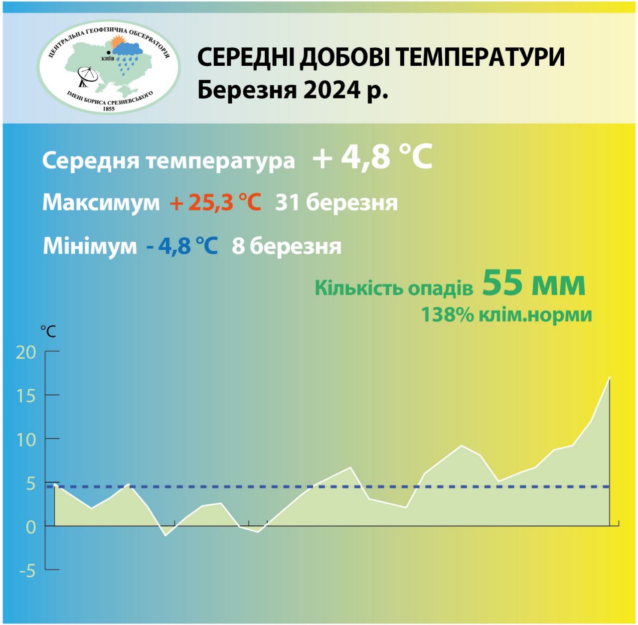 Опадів випало 55 мм або 138 % кліматичної норми.