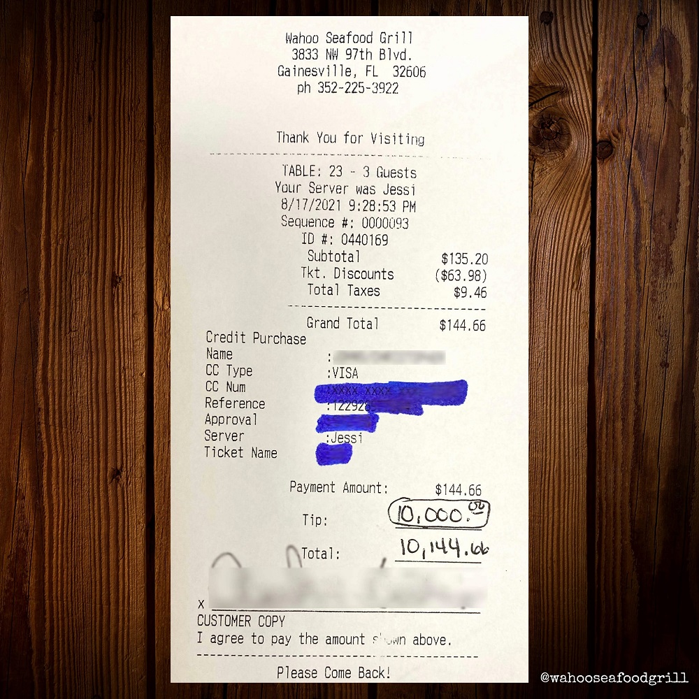 У Флориді, США, відвідувач ресторану Wahoo Seafood Grill підтримав працівників закладу у важкі часи щедрими чайовими в розмірі 10 тисяч доларів - по тисячі кожному з персоналу.