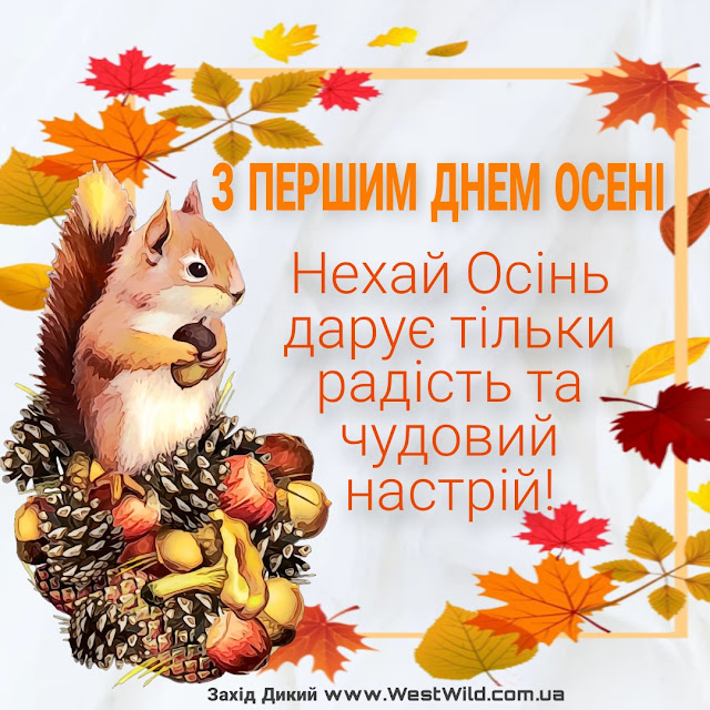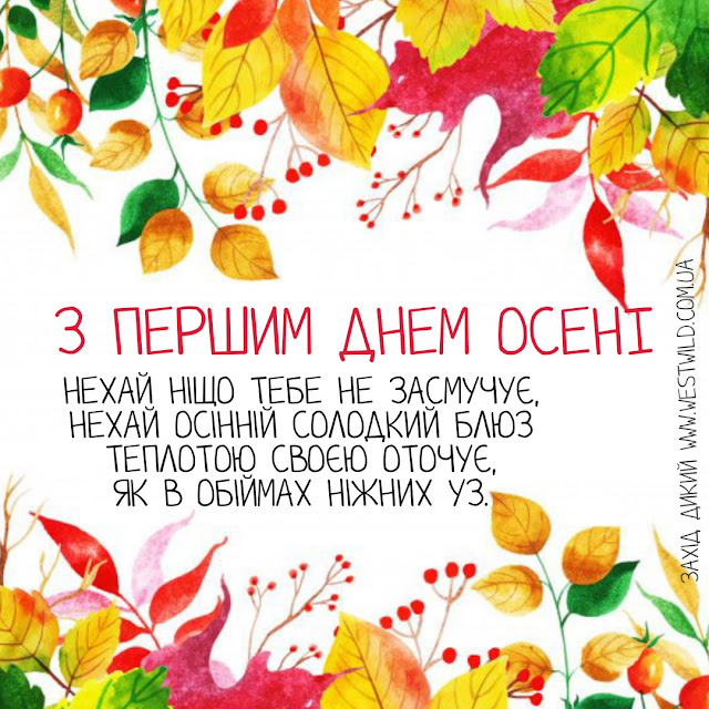 Вітаю з першим днем осені, з часом останнього привіту від сонячного тепла і аромату квітів. Бажаю цю осінь почати з чистого аркуша, наповнити її історію чудовим настроєм, красою душі і серця щастям