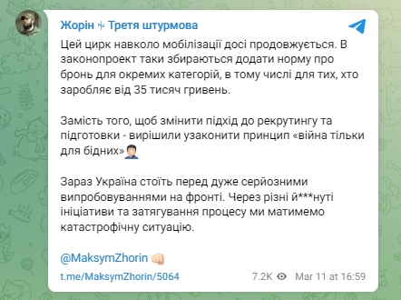 "Цей цирк навколо мобілізації досі продовжується. В законопроект таки збираються додати норму про бронь для окремих категорій, в тому числі для тих, хто заробляє від 35 тисяч гривень", - написав Жорін.