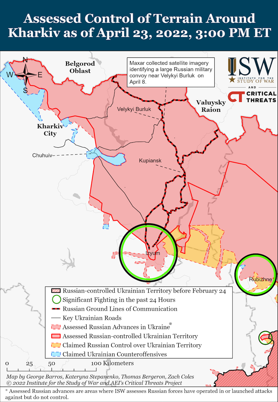 Продовжуються ворожі атаки Ізюма. Українські сили оборони зробили успішний контрнаступ у Дергачівському районі, однак окупанти зберегли позиції на північний схід від Харкова, звідки вони обстрілюють місто.
