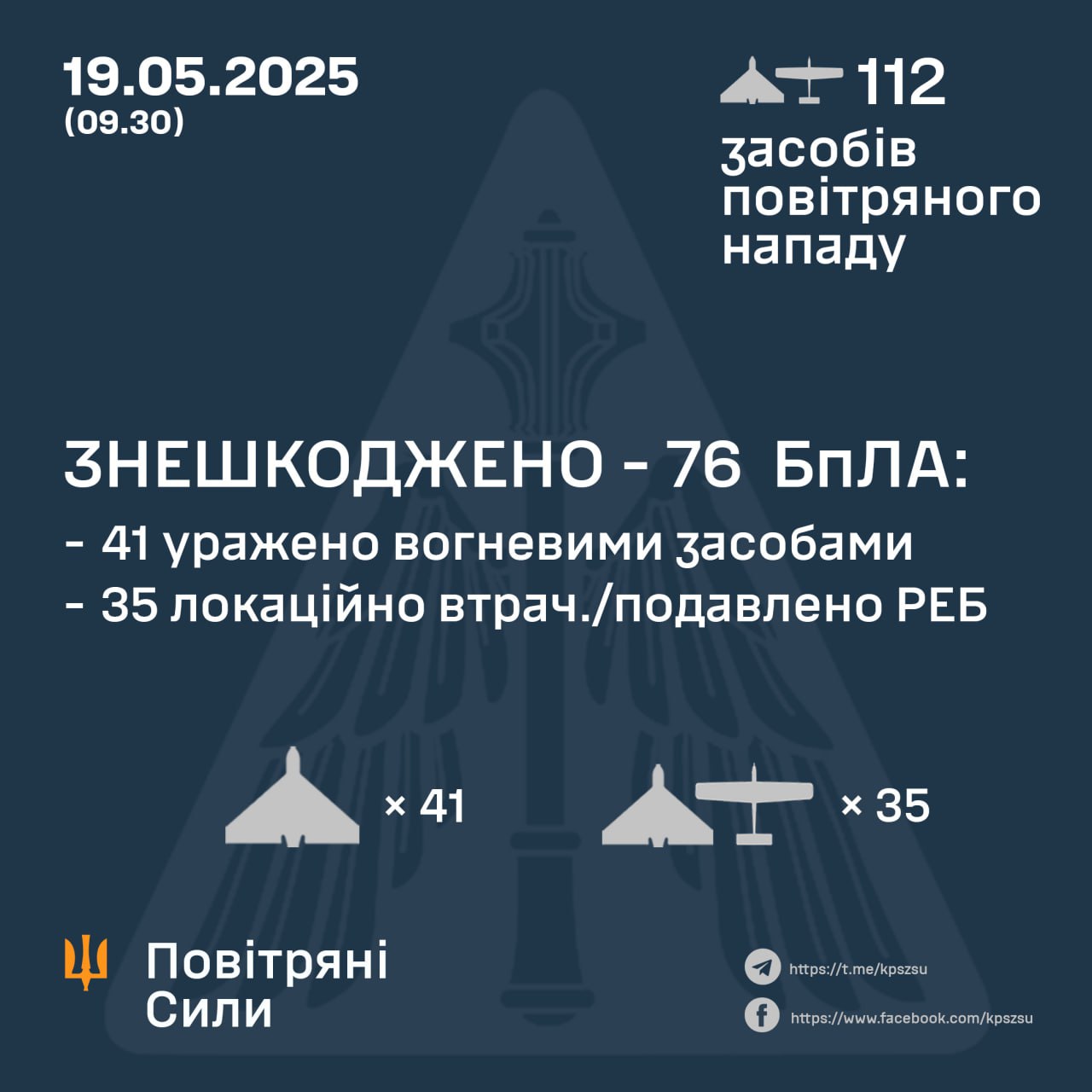 Загалом із 23.00 18 травня противник запустив 112 ударних БпЛА типу Shahed і безпілотники-імітатори різних типів із напрямків: Брянськ, Курськ, Шаталово, Орел, Міллерово.