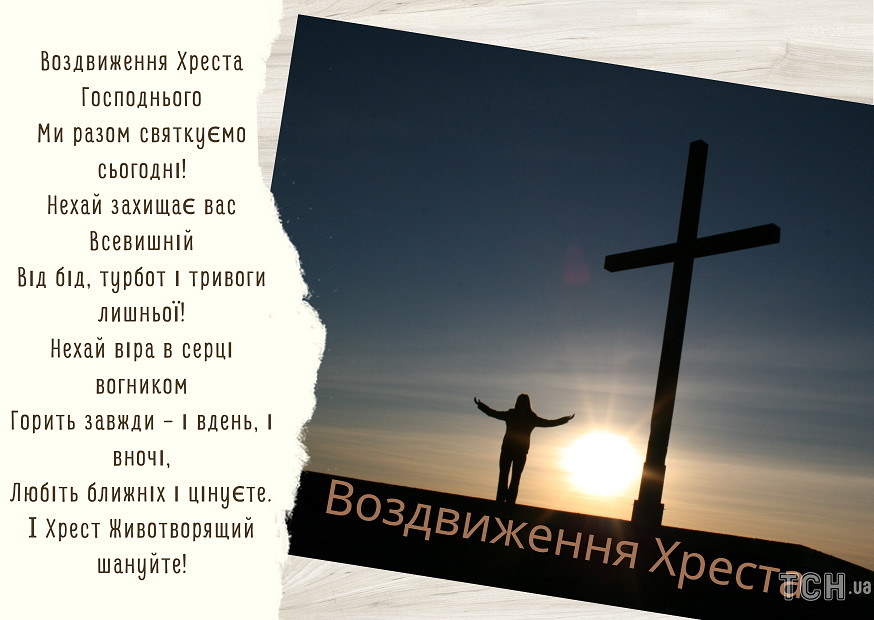 Вітаю з Воздвиженням Чесного і Животворящого Хреста Господнього. Нехай тобою рухає сила віри і терпимості. Бажаю тобі миру і спокою душі, Щастя і міцного здоров'я. Бажаю, щоб в твоєму житті не було місця брехнею і зради. Бажаю, щоб в твоєму серці вічно жила любов.