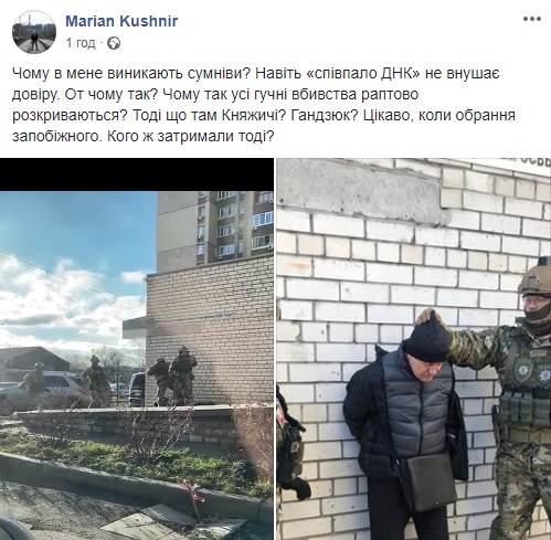"Чому у мене виникають сумніви? Навіть" збіглося ДНК "не вселяє довіри. Ось чому так? Чому всі гучні вбивства так раптово розкриваються? Тоді що там Княжичі? Гандзюк? Цікаво, коли обрання запобіжного. Кого ж затримали тоді?" - задається питаннями український журналіст Мар'ян Кушнір.