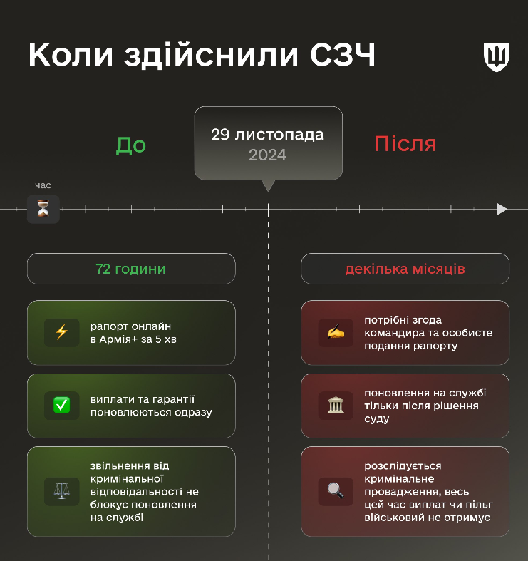 "Спрощений алгоритм не стосується військових, які здійснили СЗЧ після 29 листопада 2024 року. Такі військовослужбовці, навіть якщо це перше їхнє СЗЧ, не можуть повернутись на службу та звільнитись від кримінальної відповідальності за швидким спрощеним алгоритмом", - наголосили у Міноборони.