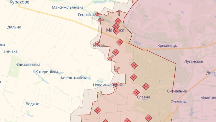 На Мар"їнському напрямку сили оборони продовжують стримувати ворога в районі Новомихайлівки Донецької області, де ворог 25 разів намагався прорвати оборону наших військ. Крім того, нашими захисниками відбито 8 атак противника в районах населених пунктів Красногорівка, Георгіївка, Побєда Донецької області.