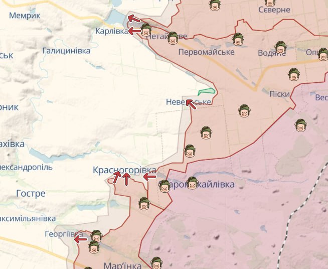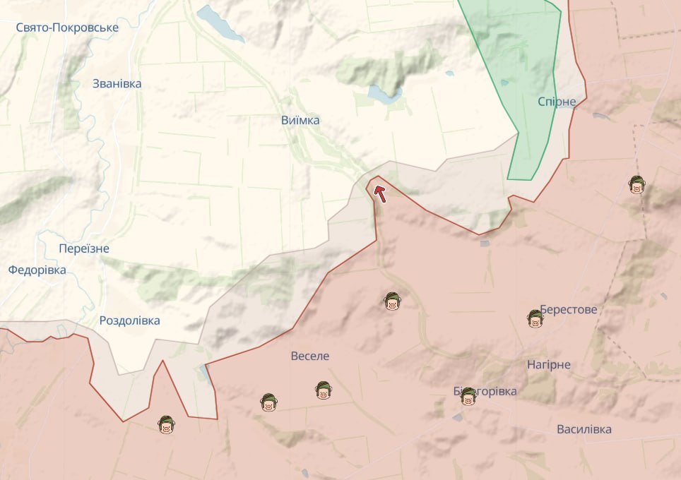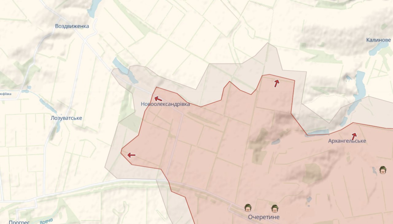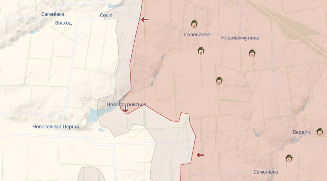 Оновлена мапа засвідчує, що на тлі позиційних боїв противник мав частковий успіх в декількох районах – зокрема аналітичний ресурс DeepState зауважує на просуванні ворожого війська на сході Донецької області, біля: