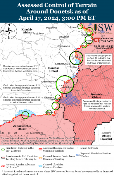 Повідомляється, що російські війська просунулися на північний схід від Часового Яру та продовжили наступальні операції. Російські війська нещодавно просунулися на захід від Авдіївки та продовжили наступальні операції у цьому районі 17 квітня.