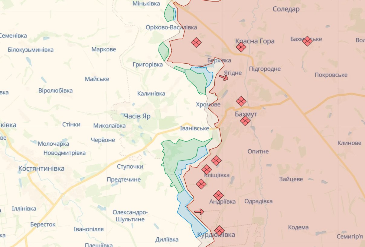 На Бахмутському напрямку противник вів безрезультатні наступальні дії в районах Григорівки та Міньківки Донецької області. Завдав авіаційного удару біля Сухої Балки на Донеччині. Від ворожих артилерійських обстрілів постраждали Васюківка, Міньківка, Оріхово-Василівка, Богданівка, Часів Яр, Іванівське, Озарянівка та Нью-Йорк Донецької області.