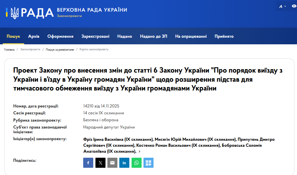 Тексту законопроєкту поки немає. Відомо лише, що документ передбачає розширення підстав для обмеження виїзду з України. Його передали на розгляд керівництва.