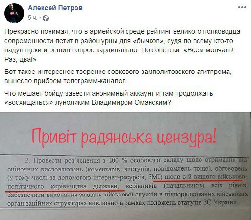 "Прекрасно розуміючи, що в армійському середовищі рейтинг великого полководця сучасності летить в район урни, судячи з усього хтось вирішив питання кардинально. По-радянськи. Всім мовчати! Раз, два! Ось таке цікаве творіння совкового замполітівського агітпрому, винесло прибоєм телеграм-каналів. Що заважає бійцеві завести анонімний аккаунт і там продовжувати "захоплюватися" луноликим Володимиром Оманським?", - зауважив блогер.