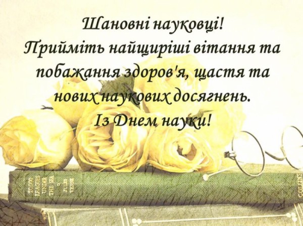 Вітаю з Днем науки та побажати хочу великих досягнень і широкого розвитку наукових галузей, приголомшливих можливостей і чудових ідей, світлої думки і бадьорості духу, великого вкладу і відмінних успіхів.