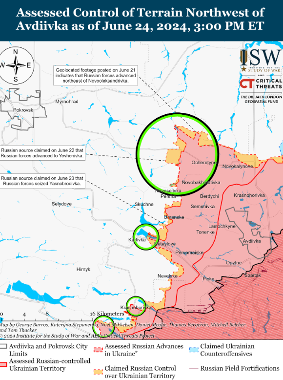 Фахівці додають, що російські війська продовжували вести наземні атаки на захід і південний захід від Донецька 24 червня, але без змін на фронті. Бої також тривали на південний захід від Донецька біля Георгіївки, Парасковіївки та Костянтинівки.