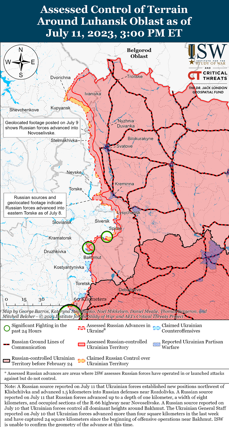 11 липня українські війська продовжили контрнаступальну операцію на північній та південній околицях Бахмута. Міністерство оборони Росії стверджувало, що російські війська, нібито, відбили українські атаки на північний захід від Кліщіївки.