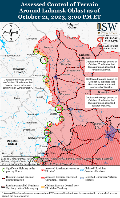 Генштаб ЗСУ зазначив, що українські війська продовжували наступальні дії на південь від Бахмута. Російські сили здійснили обмежені наземні атаки на південний захід від міста Донецьк 21 жовтня, але не досягли жодних заявлених або підтверджених успіхів.