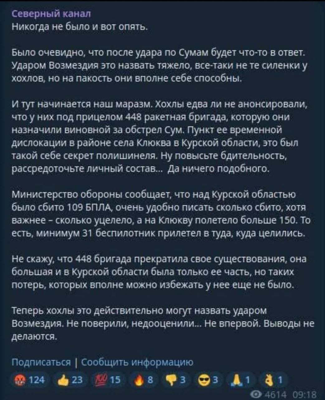 Зокрема підрозділи Сил безпілотних систем, Сил спеціальних операцій ЗС України, Служби безпеки України, у взаємодії з іншими складовими Сил оборони України, атакували низку об"єктів в Курській області, пов'язаних з воєнними злочинцями, які причетні до ракетного удару по місту Суми 13 квітня 2025 року та до інших воєнних злочинів проти народу України.
