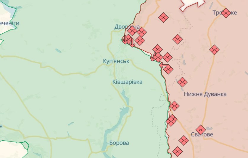 На Куп'янському напрямку ворог вів штурмові дії в районах Синьківки та східніше Петропавлівки Харківської області, де Силами оборони відбито 10 атак. Під артилерійським та мінометним вогнем опинилися понад 10 населених пунктів, зокрема, Дворічна, Синьківка, Іванівка, Берестове Харківської області.