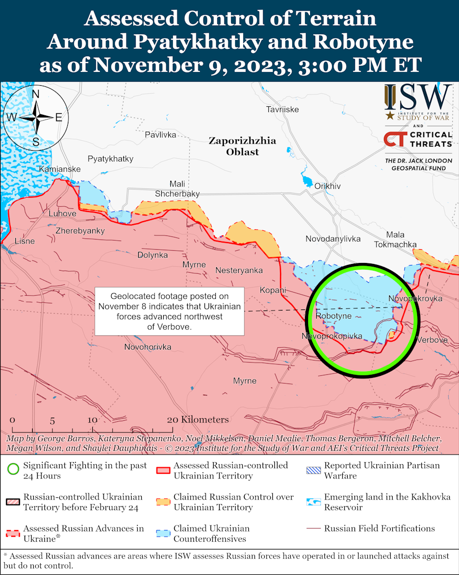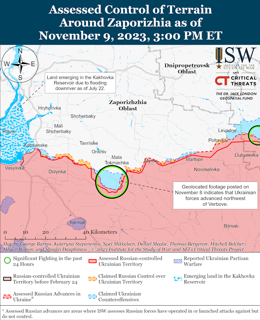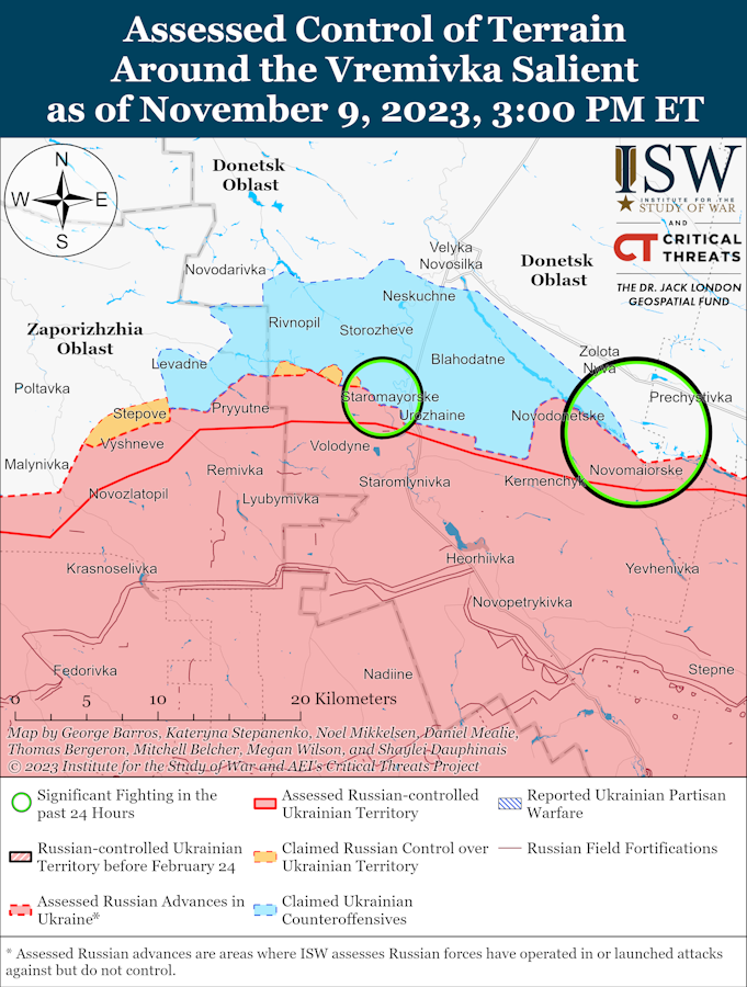 За інформацією ISW, українські війська 9 листопада не проводили жодних заявлених чи підтверджених наземних атак у районі кордону Донецької та Запорізької областей, натомість українські війська відбили російські атаки поблизу Старомайорська та на південь від Пречистівки
