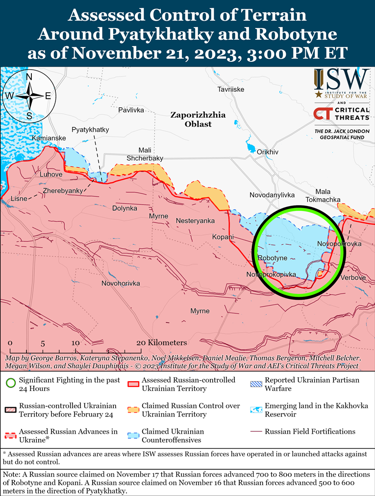 Російські джерела стверджували, що українські війська 21 листопада провели безуспішні наступальні операції у західній частині Запорізької області. Російські блогери стверджували 20 та 21 листопада, що українські війська безуспішно атакували на схід від Роботиного, поблизу Вербового та Новопрокопівки.