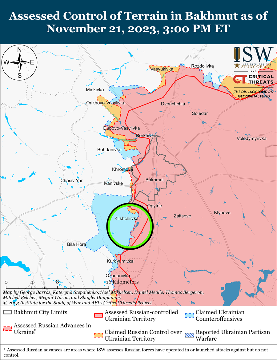 Російські війська продовжили наступальні операції під Бахмутом 21 листопада і, як повідомляється, нещодавно просунулися вперед. Російські ЗМІ заявили, що російські війська просунулися в районі Берхівського водосховища та у Кліщіївці 20 листопада. Український Генштаб 21 листопада повідомив, що українські війська відбили російські атаки в районі Кліщіївки та Андріївки.
