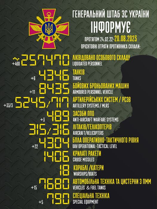 Загальні бойові втрати противника з 24.02.22 по 20.08.23 орієнтовно склали: