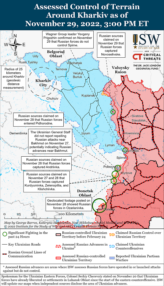 Російський блогер також заявив, що російські війська просунулися вперед в Опитному (4 км на південь від Бахмута) і 29 листопада розпочали наземну атаку на Кліщівку (7 км на південний захід від Бахмута). Крім цього російські джерела привласнили собі перемогу оперативного наступу навколо Бахмута, однак наразі немає жодних доказів того, що російські сили нині загрожують ключовим українським логістичним шляхам у Бахмут, і ISW продовжує оцінювати, що нині Бахмуту не загрожує російське оточення.