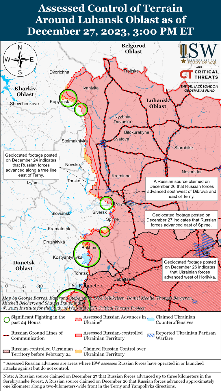 Російські та українські джерела заявили, що позиційні бої відбувалися на північний захід від Бахмута в районі Богданівки, на захід від Бахмута в районі Іванівського та у напрямку Часового Яру, і на південний захід від Бахмута в районі Кліщіївки та Андріївки. В інституті з'ясували, що українські війська нещодавно просунулися на захід від Горлівки та 27 грудня продовжили позиційні бої з російськими військами. Відео з геолокацією, опубліковане 26 грудня, показує, що українські війська просунулися далі вглиб терикону на захід від Горлівки.