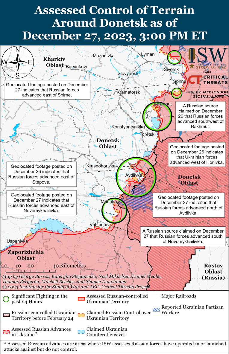 27 грудня російські війська, ймовірно, продовжили зміцнювати контроль над Мар'їнкою і нещодавно досягли успіхів на південний захід від Донецька.