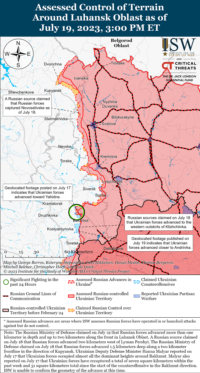 Українські війська продовжували контрнаступальні дії на північному та південному флангах Бахмута та досягли обмежених успіхів 20 липня. Геолокаційні кадри показують, що українські війська просунулися в лісовому районі Кліщіївки (7 км на південний захід від Бахмута).