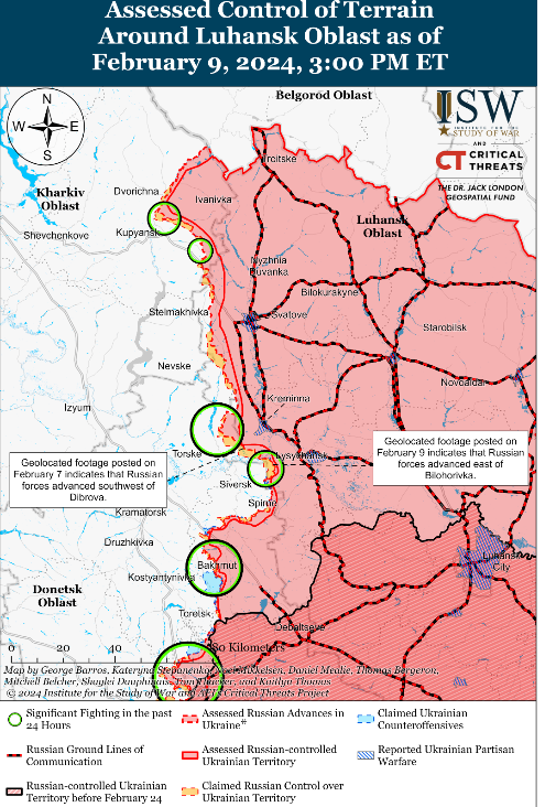 Станом на 9 лютого в Луганській області тривали позиційні бої вздовж всієї лінії Куп'янськ-Сватово-Кремінна. Російські війська змогли частково просунутися на схід від Білогорівки.