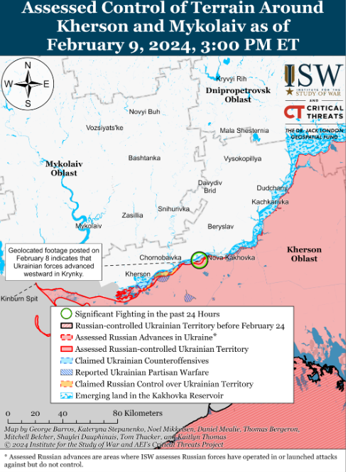 РБК-Україна повідомили, що, відповідно до відео з геолокацією за 8 лютого, українські війська досягли певних успіхів у Кринках на лівому березі Херсонської області. Повідомляється, що позиційні бої тривали на східному березі Херсонської області також і 9 лютого.