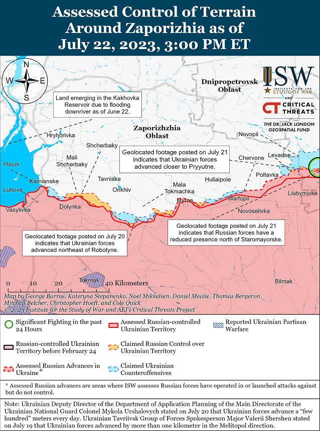 22 липня українські війська вели наступальні дії на заході Запорізької області без просування. У Генштабі України повідомили, що українські війська продовжували наступальні дії на мелітопольському (західна частина Запорізької області) напрямку. Речник російського Східного угруповання військ Олег Чехов і кілька російських милблогерів стверджували, що українські війська невдало атакували поблизу Роботиного (12 км на південь від Оріхова). Пов"язаний з Кремлем мілблогер заявив, що українські сили з бронетехнікою здійснили три атаки на Роботине.