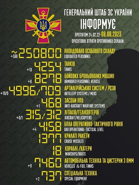 Загальні бойові втрати противника з 24.02.22 по 08.08.23 орієнтовно склали: