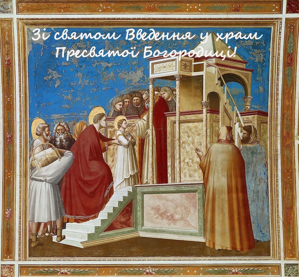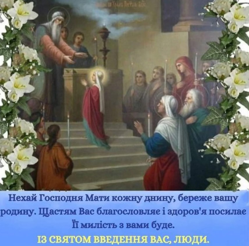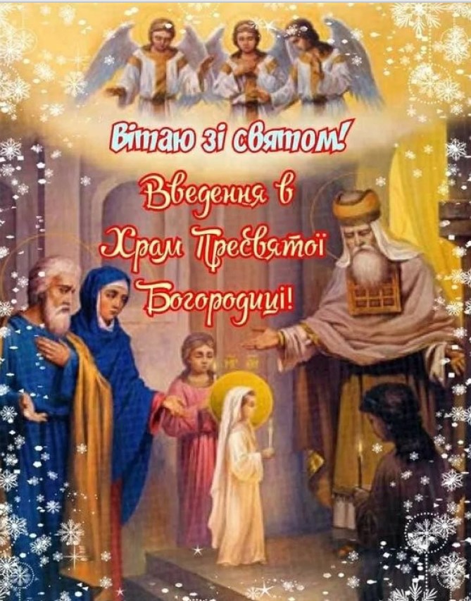 Дорогі християни, вітаємо вас зі святом введення в храм Пресвятої Богородиці, бажаємо сьогодні і завжди не забувати про відвідування церкви, бути твердими у своїй вірі і смиренними в повсякденних справах своїх. Нехай дасть вам Господь сили пройти всі випробування земні з легкістю і жодного разу не засумніватися в милості Божій.