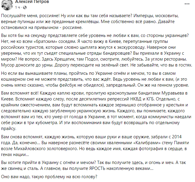 "Послухайте мене, росіяни! Ну чи як ви там себе називаєте? Імперці, московити... якщо ви виношуєте плани, пройтися по Україні вогнем і мечем, то ви в найкошмарнішому сні не можете уявити, що на вас чекає. Адже рівень не любові до вас, (і це дуже м'яко сказано, щоби фейсбук не образився), позамежний. Він же генетичний. Вам згадають усе! Кожну краплю крові, пролиту червонопузими бандитами Муравйова у Києві. Згадають кожну сльозу після десятирічних репресій НКВС та КДБ. Окремо, з крайньою жорстокістю, вам згадуватимуть кожне зернятко відібране у селян і відтак кожне загублене українське життя", - наголосив Петров.