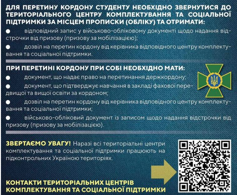Студенти призовного віку, які навчаються у навчальних закладах за межами України під час воєнного стану, можуть виїжджати за кордон для продовження навчання.