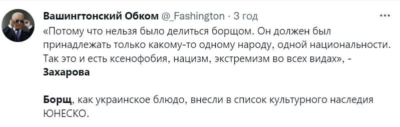 Зокрема, розкритикували спікера МЗС РФ Марію Захарову, яка зверхньо сприйняла новину про приналежність борщу виключно Україні, назвавши це - "київським націоналізмом". Мовляв, хумус і плов визнано національними стравами кількох народів, а в Україні "українізації піддається все".