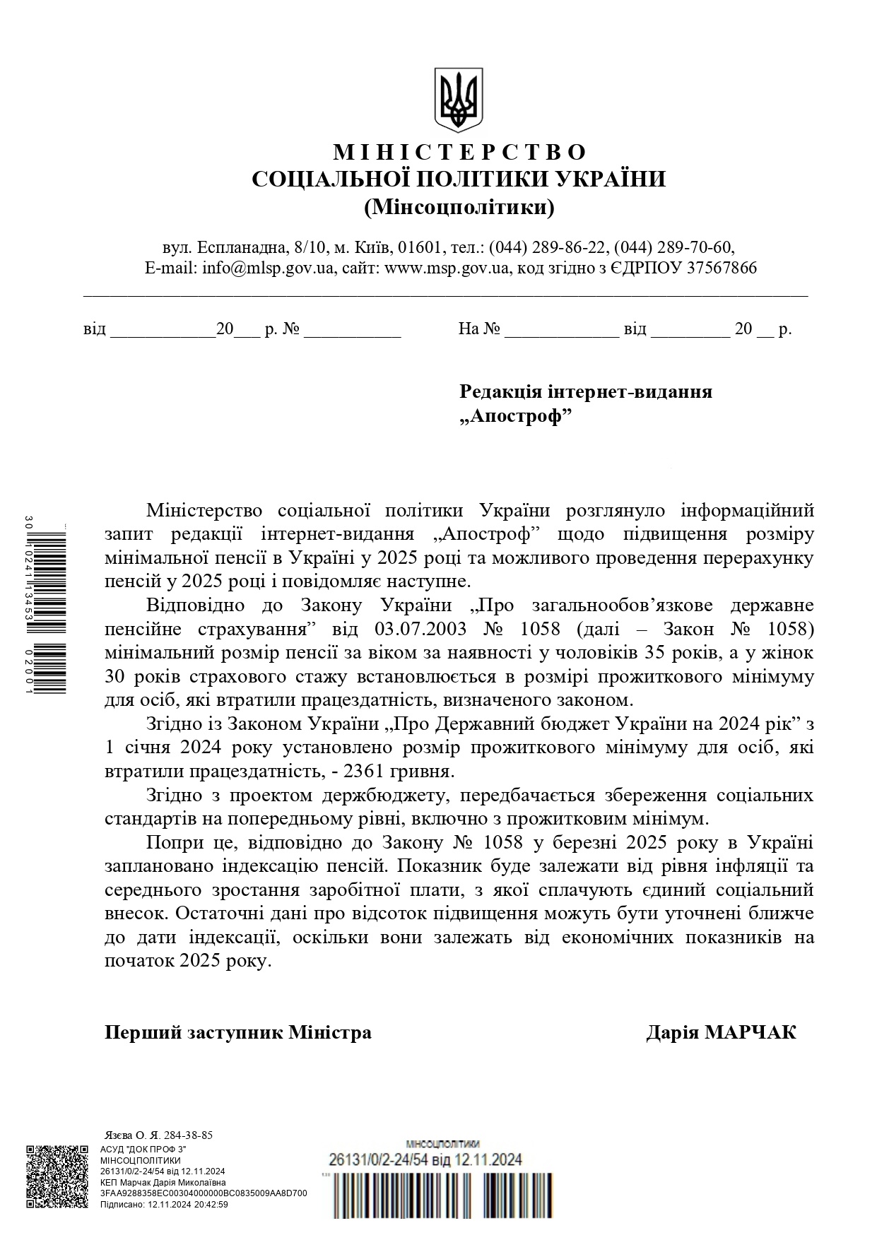 "Згідно із законом України "Про державний бюджет України на 2024 рік" з 1 січня 2024 року установлено розмір прожиткового мінімуму для осіб, які втратили працездатність, - 2361 гривня. Згідно з проектом держбюджету (на 2025 рік – "Апостроф"), передбачається збереження соціальних стандартів на попередньому рівні, включно з прожитковим мінімум", - йдеться у повідомленні міністерства.