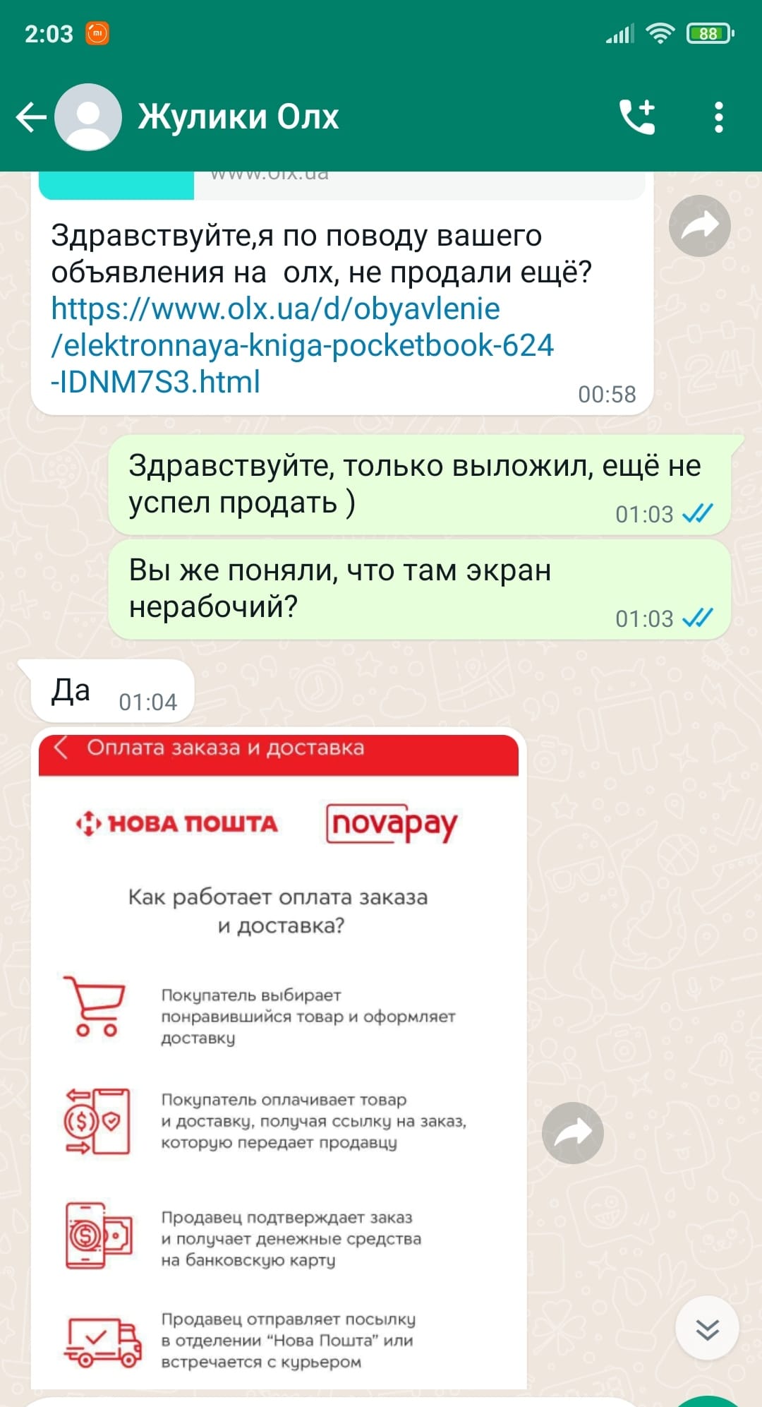 Видання наводить приклад, як один з українських блогерів Вадим Фульмахт ледве не втратив кошти, однак встиг розгледіти, що сайт підробний. Знайшли його шахраї на сайті оголошень OLX, де він продавав йому непотрібні речі. З ним через Whatsapp зв'язалася така собі Анастасія, яка хотіла придбати товар. Після чого запропонувала оформити відправку товару за допомогою нової послуги "novapay від Нової пошти", на кшталт OLX-доставки.