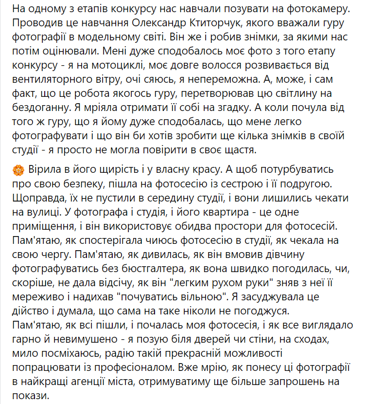У скандалі навколо відомого київського фотографа Олександра Ктиторчука, якого затримали за підозрою в розбещенні неповнолітніх дівчаток, з'явилися нові подробиці. Одна з жертв розпусника розповіла, як її у 17-річному віці згвалтував Ктиторчук.