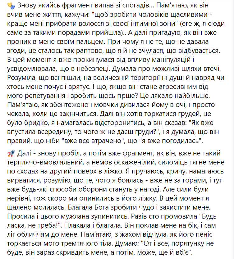 Дівчина додала, що після пережитого забрала у фотографа свої знімки на носії й пішла, однак після згвалтування назавжди залишилася душевна травма і вона вирішила розповісти про пережите, щоб привернути увагу до питання покарання гвалтівника.