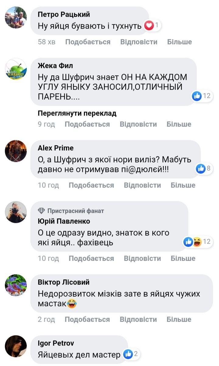 "Яйцевих справ майстер", "Шуфрич особисто порівняв", "О, це відразу видно, знавець, у кого які яйця. Фахівець", - пишуть коментатори.