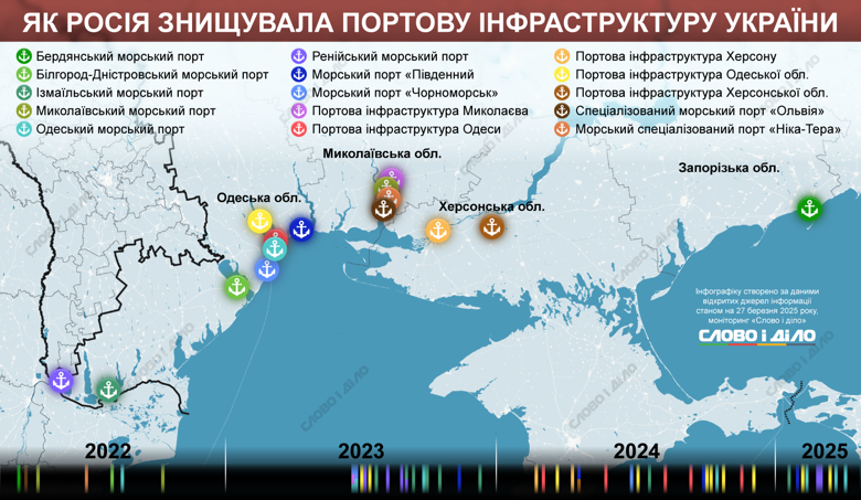 У 2022 році РФ сім разів била по українських портах – у Бердянську, Білгород-Дністровському, в Одесі, двічі у Миколаєві, а також по портах "Ольвія" та "Ніка-Тера".