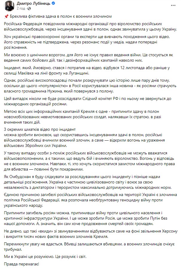 "Вогонь у відповідь не є воєнним злочином. Навпаки, ті, хто хочуть скористатися захистом міжнародного права для вбивства – повинні бути покараними. Єдиною причиною загибелі російських військовослужбовців на території Україні є злочинна політика Російської Федерації, яка розпочала необґрунтовану геноцидну війну проти українського народу", - повідомив Лубінець.